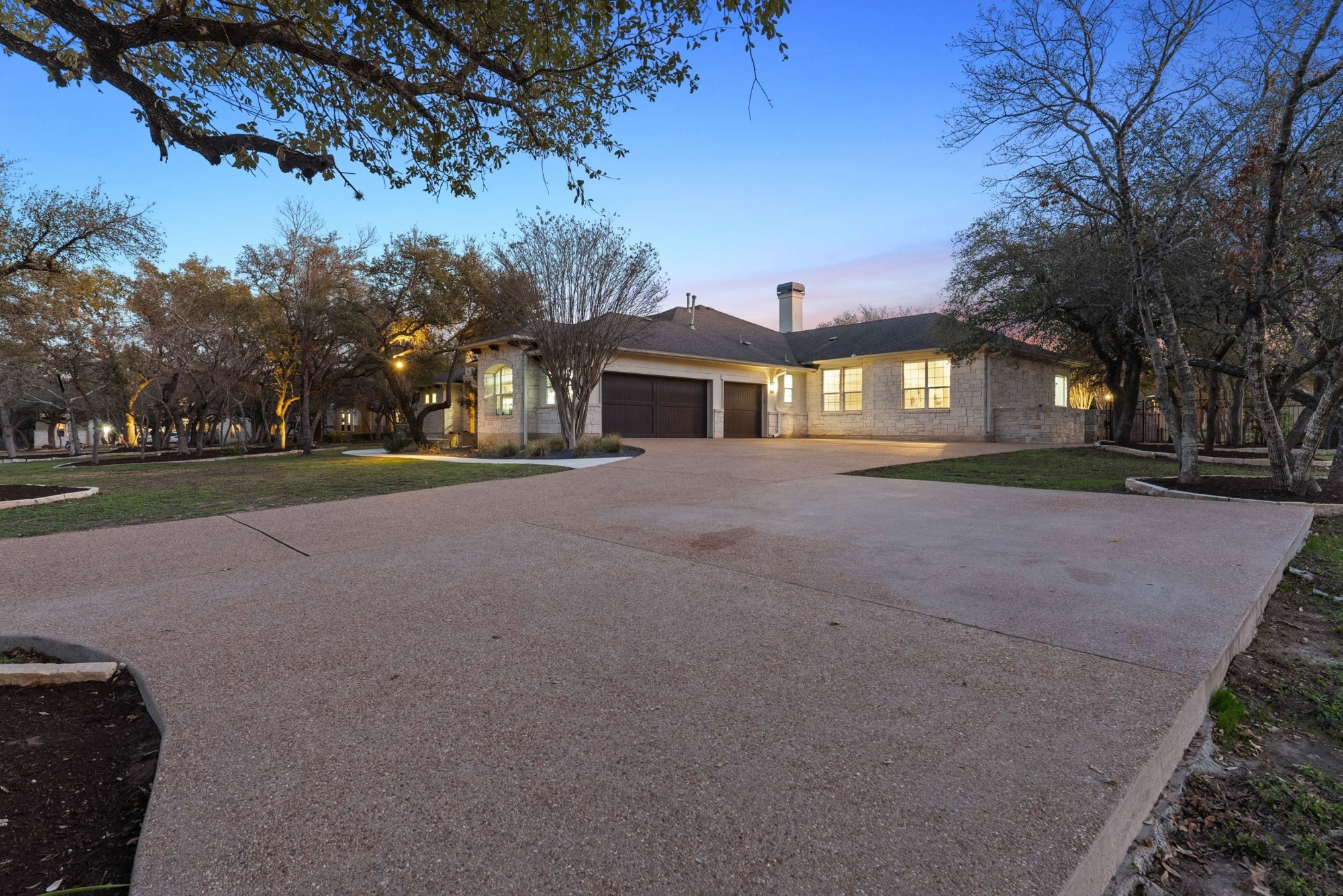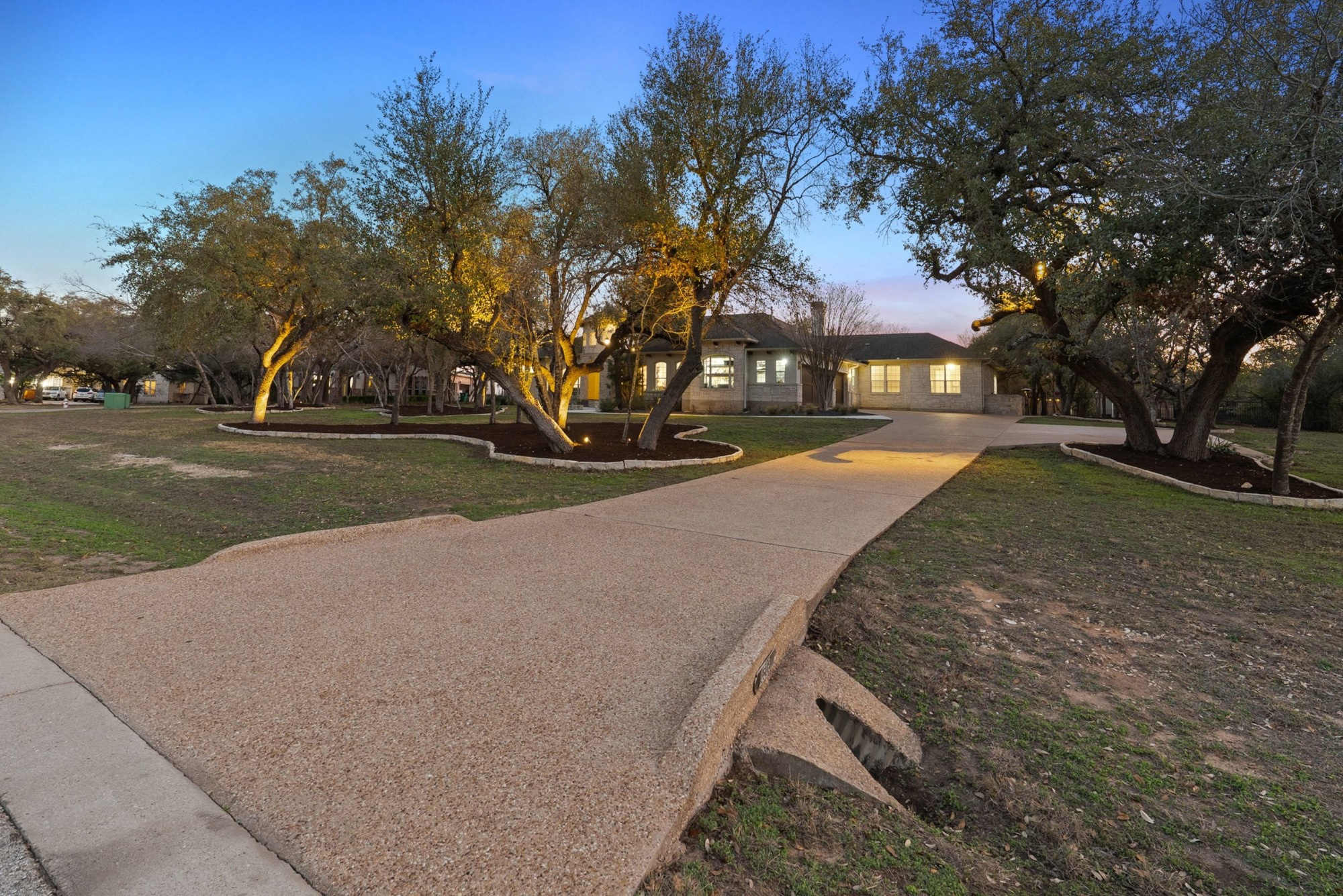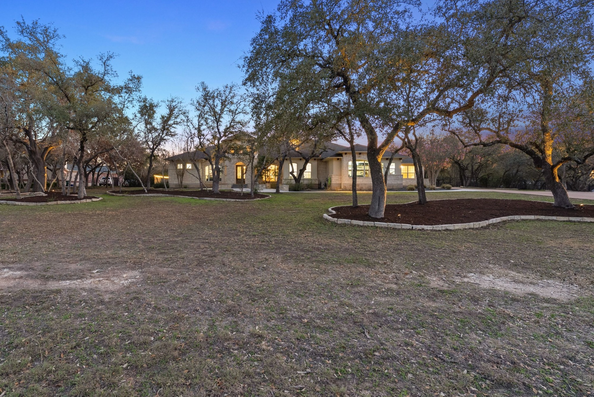 Welcome to your stunning retreat in The Reserve at Hudson Bend. Nestled at the end of a cul-de-sac on a 1.5-acre wooded lot, this home offers a tranquil, park-like setting. A custom fountain and rotunda porch welcome you inside this expansive single-level plan, featuring comfortable living spaces with a home office, formal dining, and open kitchen and living areas with a fireplace, all accented by archways and tray ceilings.
