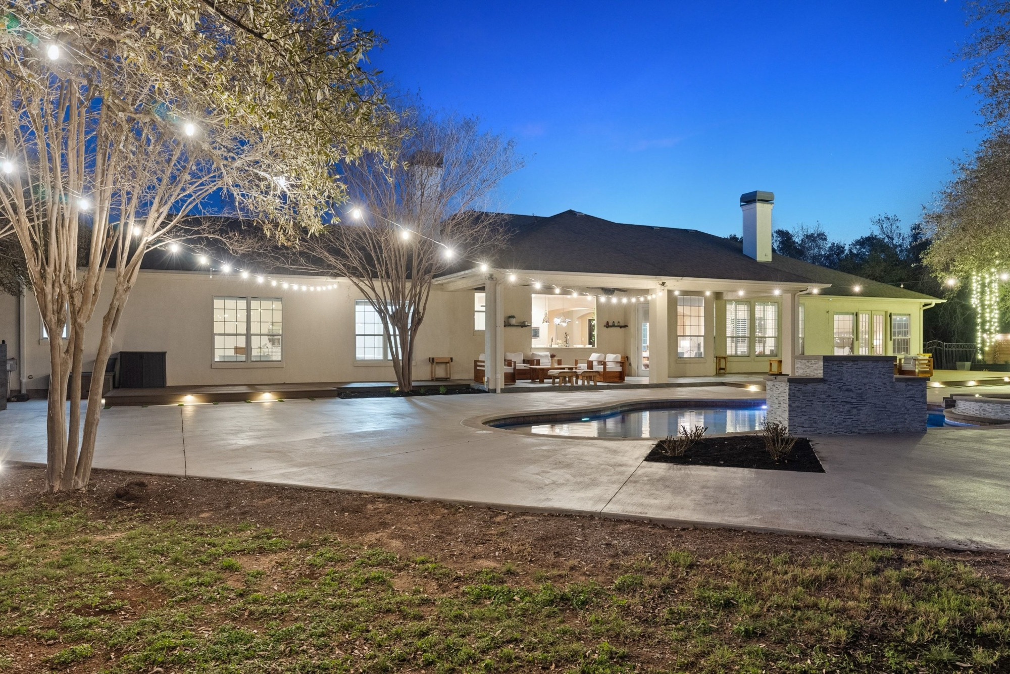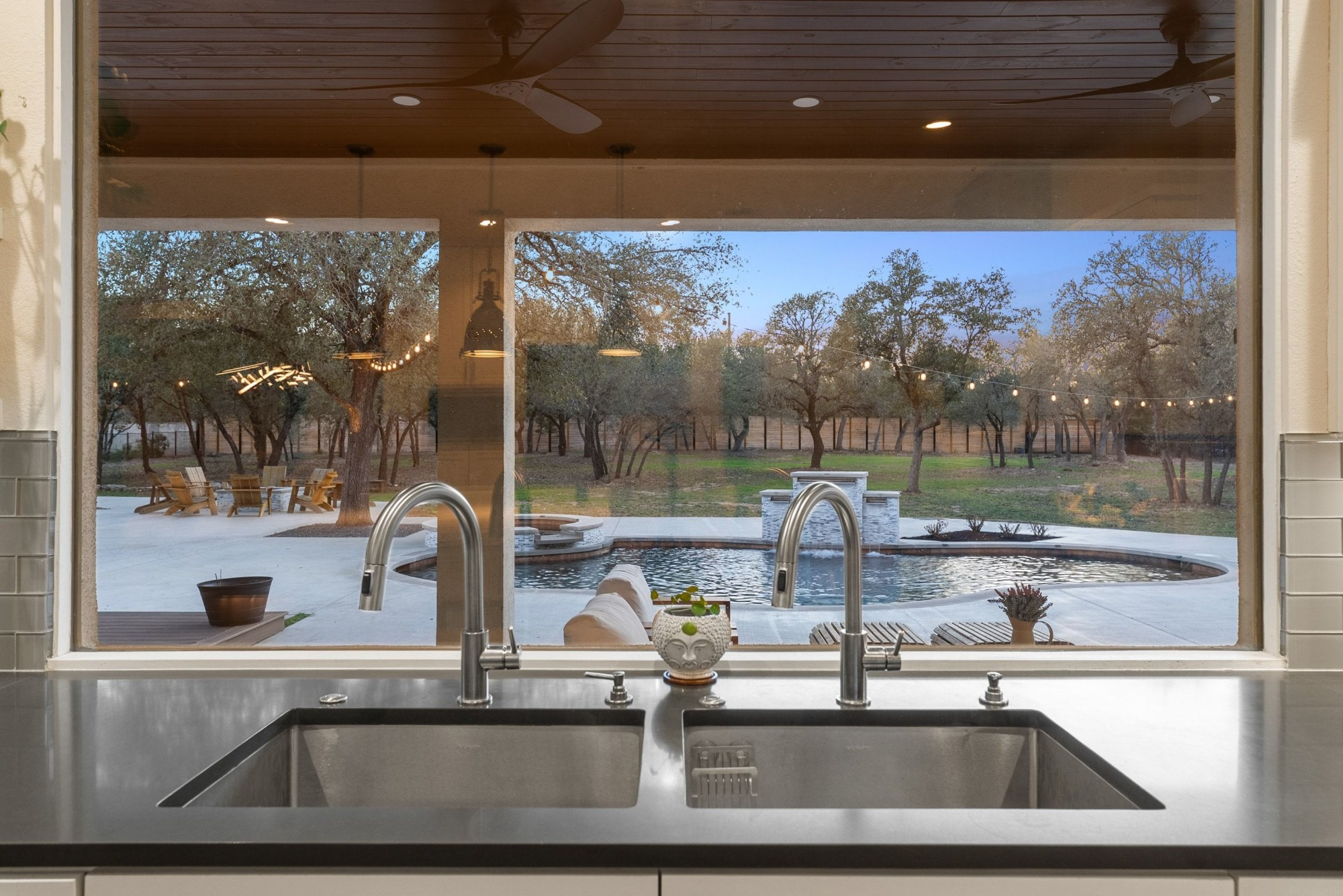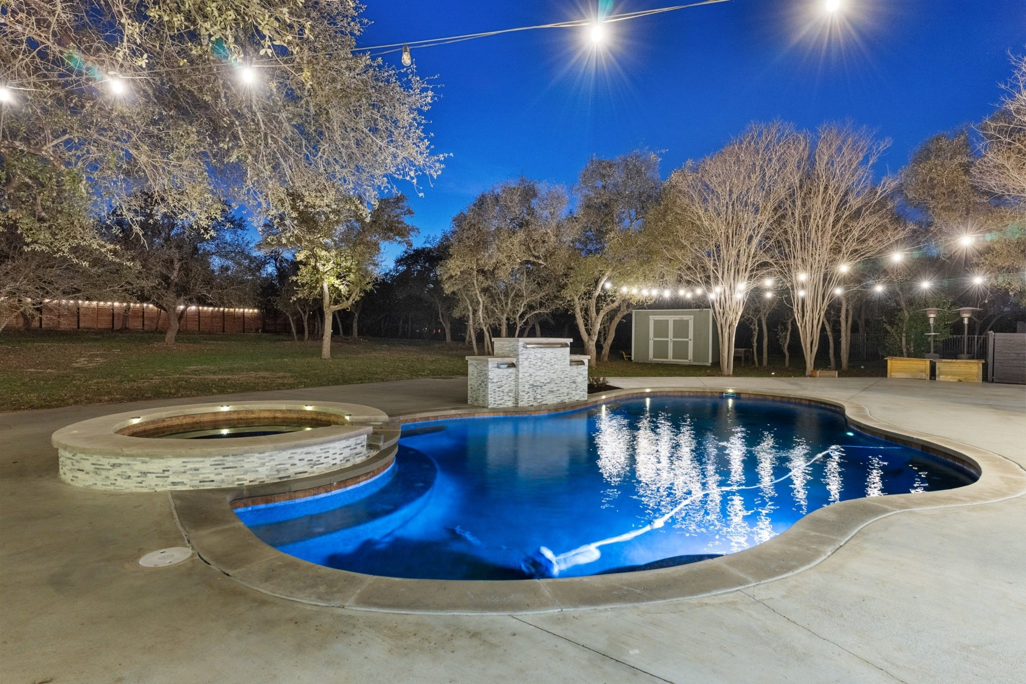 Pool, spa, waterfall, firepit